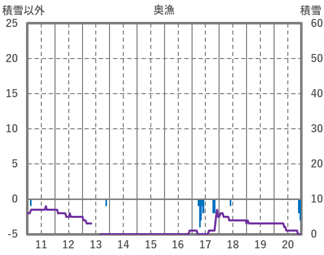 | 日 | 時 | 気温 | 降水 | 風向/風速 | 日照 | 積雪 | 降雪 |