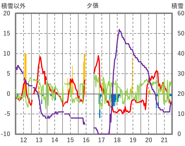 | 日 | 時 | 気温 | 降水 | 風向/風速 | 日照 | 積雪 | 降雪 |