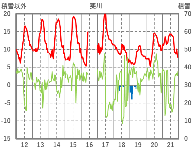 | 日 | 時 | 気温 | 降水 | 風向/風速 | 日照 | 積雪 | 降雪 |