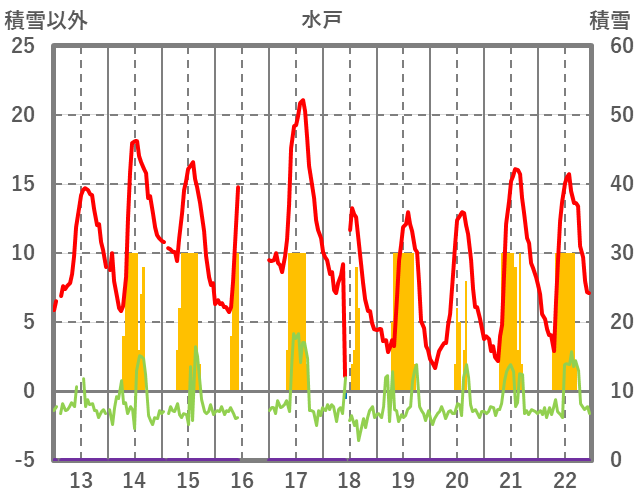 | 日 | 時 | 気温 | 降水 | 風向/風速 | 日照 | 積雪 | 降雪 |
