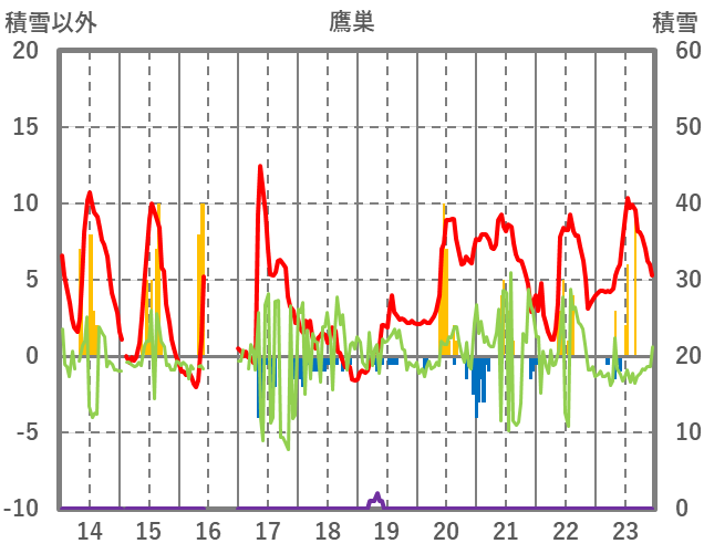 | 日 | 時 | 気温 | 降水 | 風向/風速 | 日照 | 積雪 | 降雪 |