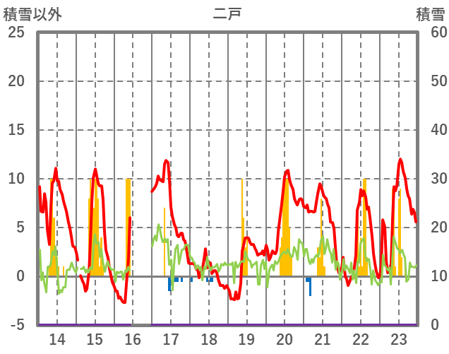 | 日 | 時 | 気温 | 降水 | 風向/風速 | 日照 | 積雪 | 降雪 |