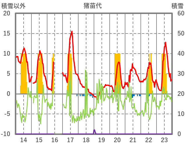 | 日 | 時 | 気温 | 降水 | 風向/風速 | 日照 | 積雪 | 降雪 |