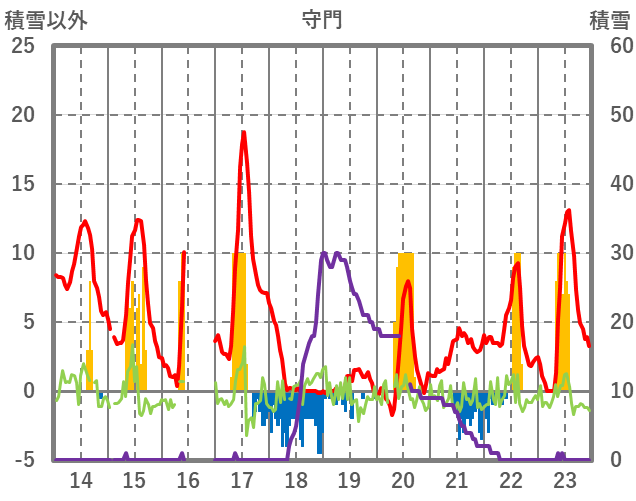 | 日 | 時 | 気温 | 降水 | 風向/風速 | 日照 | 積雪 | 降雪 |