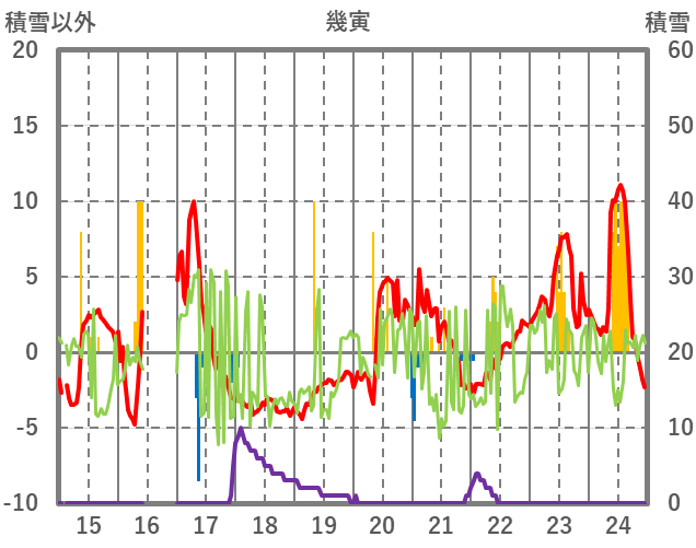 | 日 | 時 | 気温 | 降水 | 風向/風速 | 日照 | 積雪 | 降雪 |