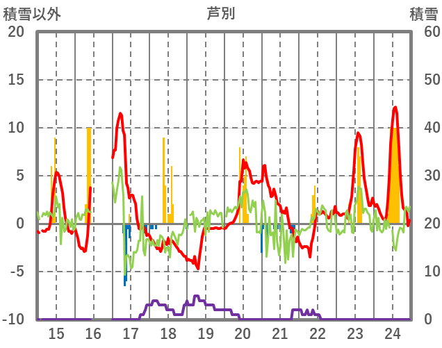 | 日 | 時 | 気温 | 降水 | 風向/風速 | 日照 | 積雪 | 降雪 |