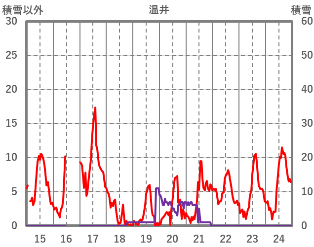| 日 | 時 | 気温 | 降水 | 風向/風速 | 日照 | 積雪 | 降雪 |
