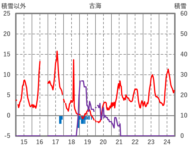 | 日 | 時 | 気温 | 降水 | 風向/風速 | 日照 | 積雪 | 降雪 |
