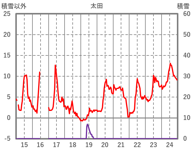 | 日 | 時 | 気温 | 降水 | 風向/風速 | 日照 | 積雪 | 降雪 |