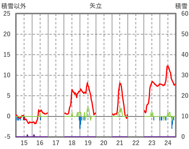 | 日 | 時 | 気温 | 降水 | 風向/風速 | 日照 | 積雪 | 降雪 |