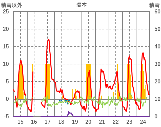 | 日 | 時 | 気温 | 降水 | 風向/風速 | 日照 | 積雪 | 降雪 |