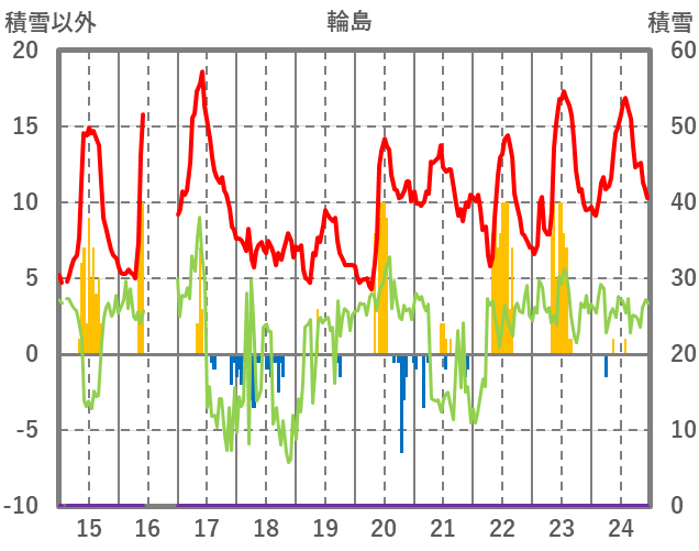 | 日 | 時 | 気温 | 降水 | 風向/風速 | 日照 | 積雪 | 降雪 |
