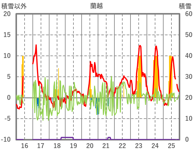 | 日 | 時 | 気温 | 降水 | 風向/風速 | 日照 | 積雪 | 降雪 |