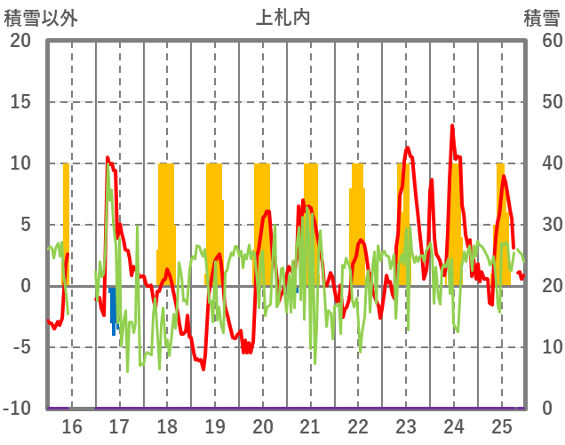 | 日 | 時 | 気温 | 降水 | 風向/風速 | 日照 | 積雪 | 降雪 |