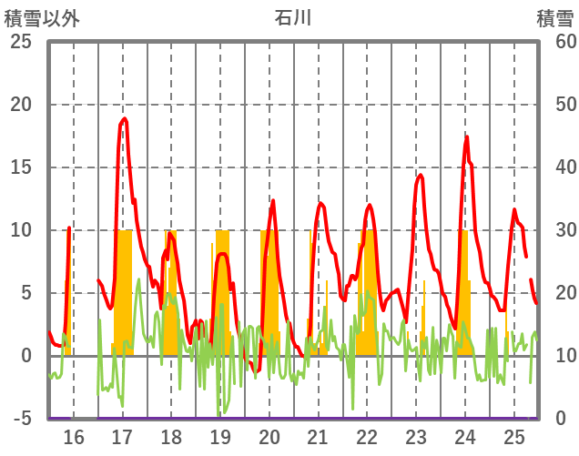 | 日 | 時 | 気温 | 降水 | 風向/風速 | 日照 | 積雪 | 降雪 |