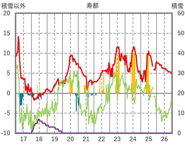 | 日 | 時 | 気温 | 降水 | 風向/風速 | 日照 | 積雪 | 降雪 |