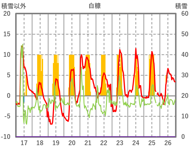 | 日 | 時 | 気温 | 降水 | 風向/風速 | 日照 | 積雪 | 降雪 |