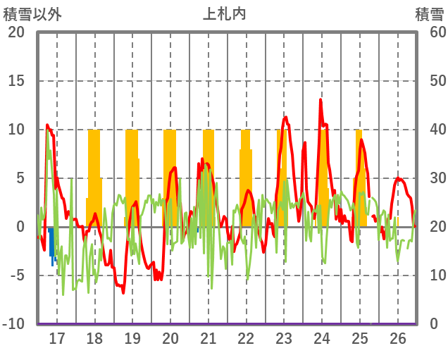 | 日 | 時 | 気温 | 降水 | 風向/風速 | 日照 | 積雪 | 降雪 |