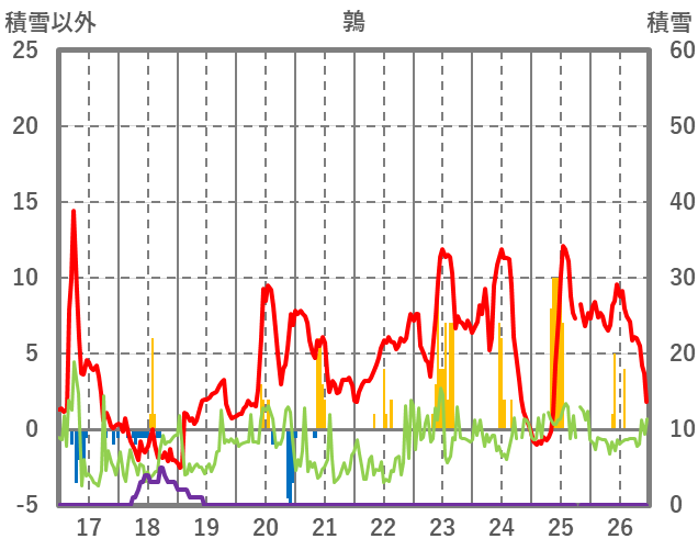 | 日 | 時 | 気温 | 降水 | 風向/風速 | 日照 | 積雪 | 降雪 |