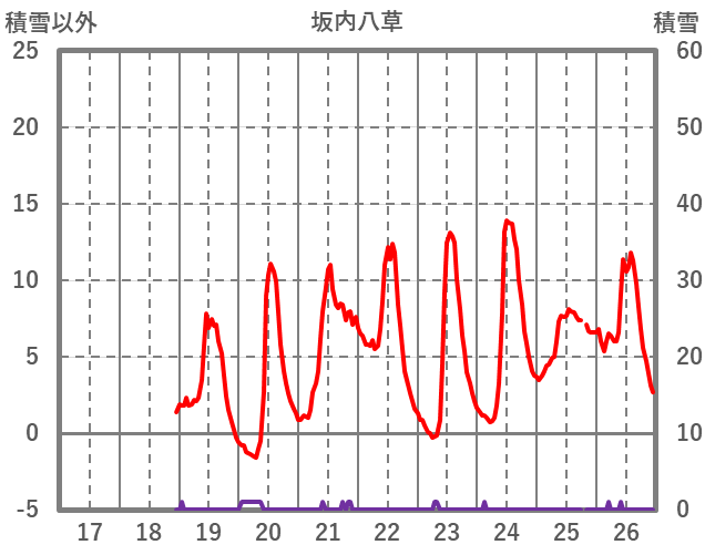 | 日 | 時 | 気温 | 降水 | 風向/風速 | 日照 | 積雪 | 降雪 |