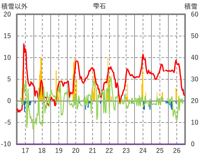 | 日 | 時 | 気温 | 降水 | 風向/風速 | 日照 | 積雪 | 降雪 |