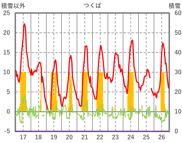 | 日 | 時 | 気温 | 降水 | 風向/風速 | 日照 | 積雪 | 降雪 |