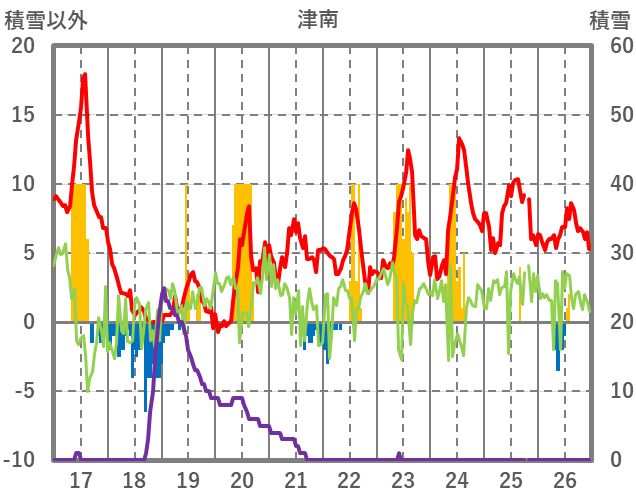 | 日 | 時 | 気温 | 降水 | 風向/風速 | 日照 | 積雪 | 降雪 |