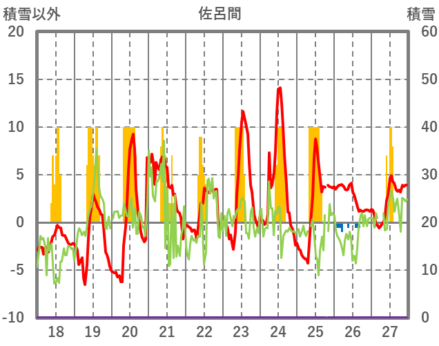 | 日 | 時 | 気温 | 降水 | 風向/風速 | 日照 | 積雪 | 降雪 |