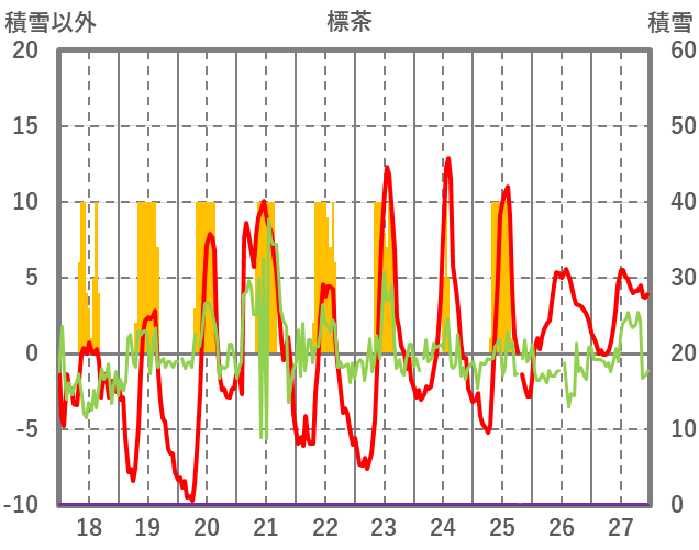 | 日 | 時 | 気温 | 降水 | 風向/風速 | 日照 | 積雪 | 降雪 |