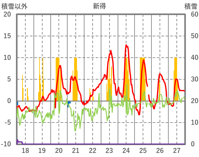 | 日 | 時 | 気温 | 降水 | 風向/風速 | 日照 | 積雪 | 降雪 |