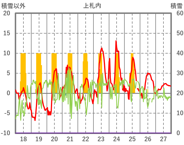 | 日 | 時 | 気温 | 降水 | 風向/風速 | 日照 | 積雪 | 降雪 |