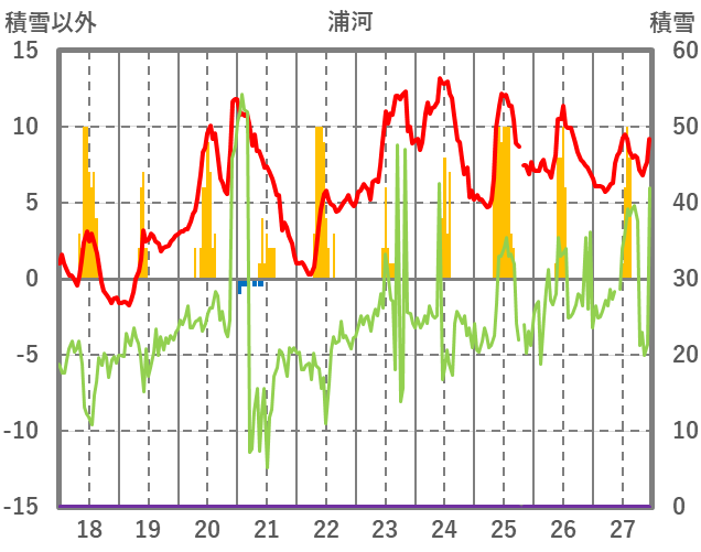 | 日 | 時 | 気温 | 降水 | 風向/風速 | 日照 | 積雪 | 降雪 |