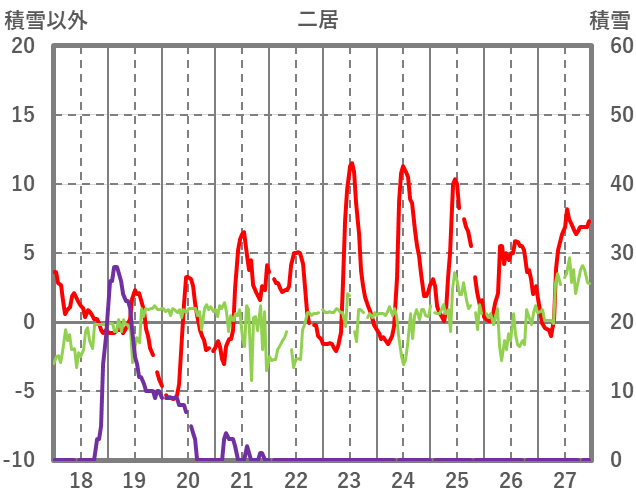 | 日 | 時 | 気温 | 降水 | 風向/風速 | 日照 | 積雪 | 降雪 |