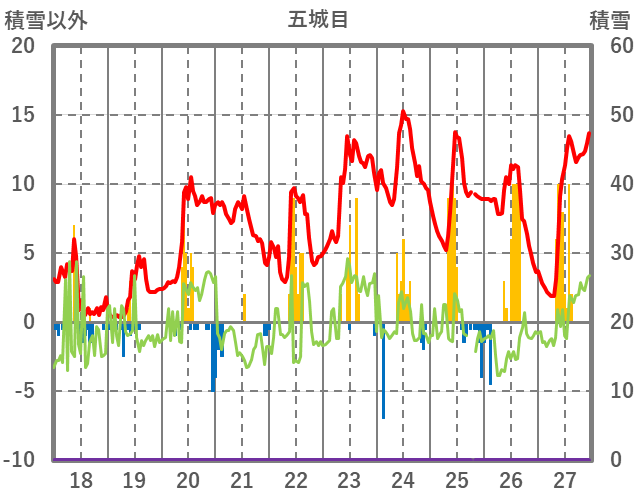 | 日 | 時 | 気温 | 降水 | 風向/風速 | 日照 | 積雪 | 降雪 |