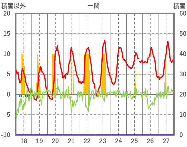 | 日 | 時 | 気温 | 降水 | 風向/風速 | 日照 | 積雪 | 降雪 |