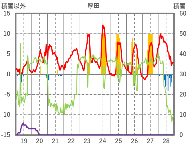 | 日 | 時 | 気温 | 降水 | 風向/風速 | 日照 | 積雪 | 降雪 |