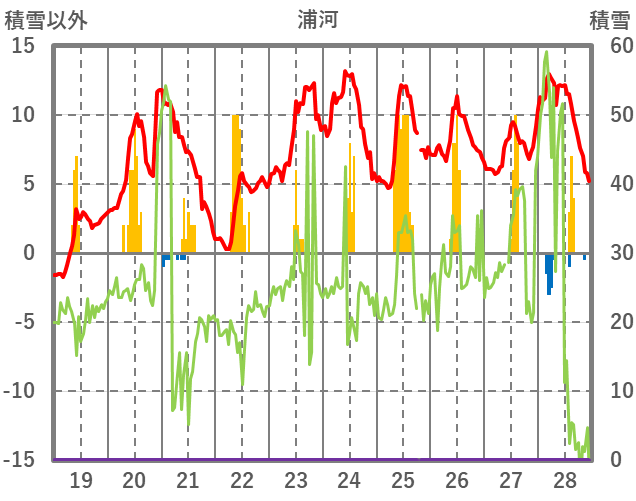 | 日 | 時 | 気温 | 降水 | 風向/風速 | 日照 | 積雪 | 降雪 |