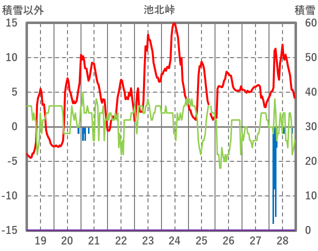 | 日 | 時 | 気温 | 降水 | 風向/風速 | 日照 | 積雪 | 降雪 |