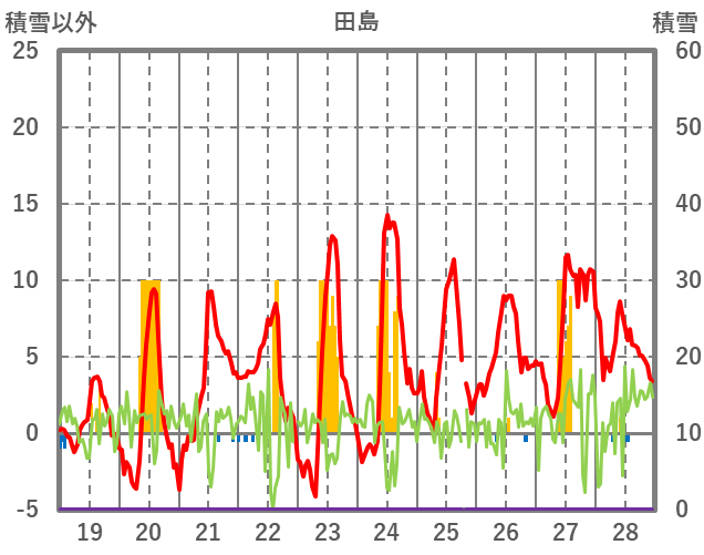 | 日 | 時 | 気温 | 降水 | 風向/風速 | 日照 | 積雪 | 降雪 |