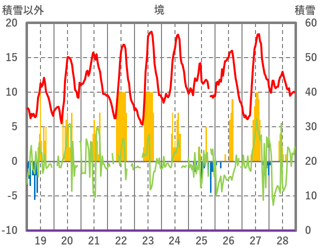 | 日 | 時 | 気温 | 降水 | 風向/風速 | 日照 | 積雪 | 降雪 |