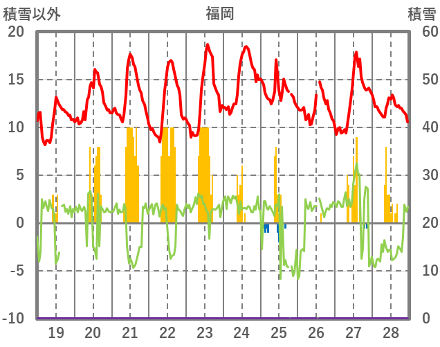 | 日 | 時 | 気温 | 降水 | 風向/風速 | 日照 | 積雪 | 降雪 |