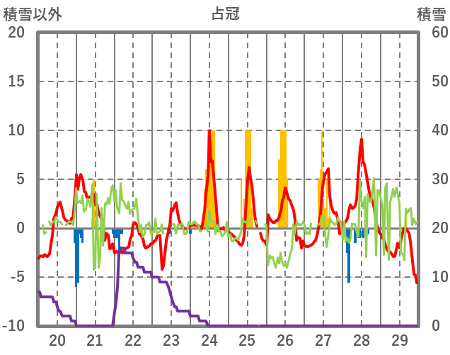 | 日 | 時 | 気温 | 降水 | 風向/風速 | 日照 | 積雪 | 降雪 |
