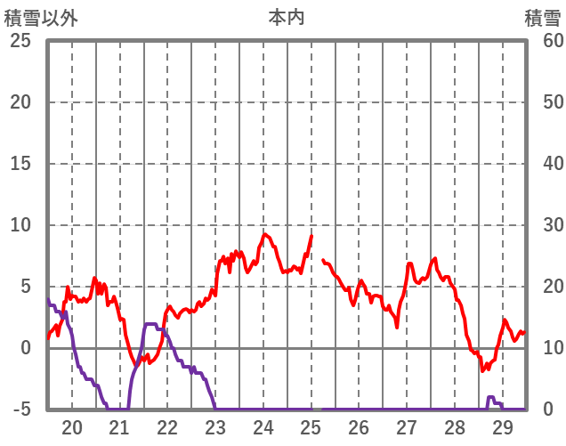 | 日 | 時 | 気温 | 降水 | 風向/風速 | 日照 | 積雪 | 降雪 |