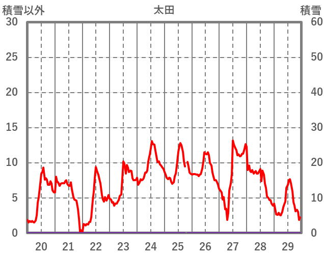 | 日 | 時 | 気温 | 降水 | 風向/風速 | 日照 | 積雪 | 降雪 |