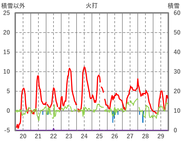 | 日 | 時 | 気温 | 降水 | 風向/風速 | 日照 | 積雪 | 降雪 |