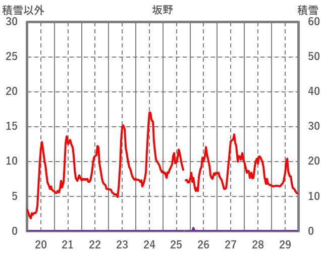 | 日 | 時 | 気温 | 降水 | 風向/風速 | 日照 | 積雪 | 降雪 |