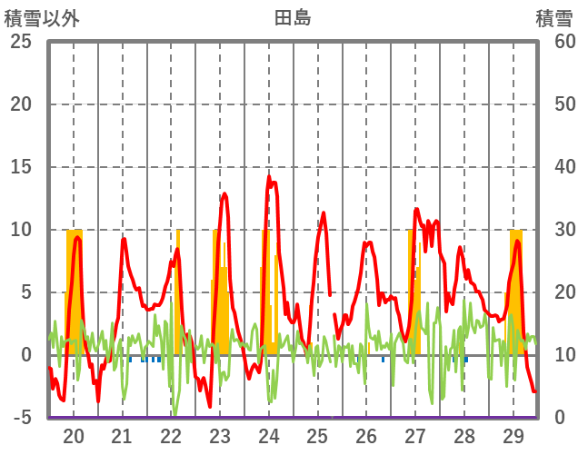 | 日 | 時 | 気温 | 降水 | 風向/風速 | 日照 | 積雪 | 降雪 |
