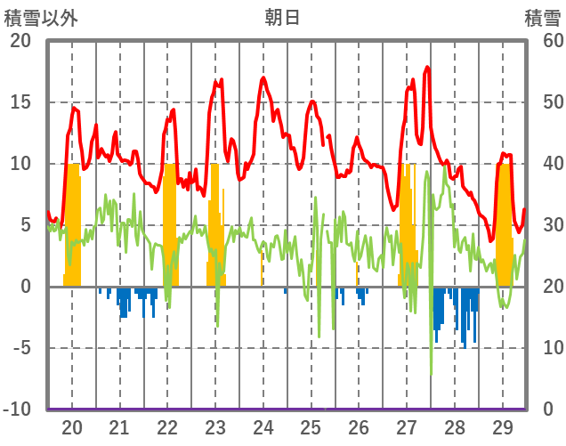 | 日 | 時 | 気温 | 降水 | 風向/風速 | 日照 | 積雪 | 降雪 |