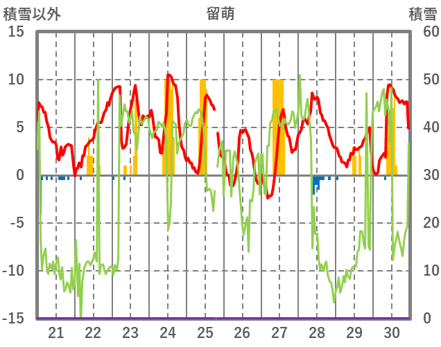 | 日 | 時 | 気温 | 降水 | 風向/風速 | 日照 | 積雪 | 降雪 |