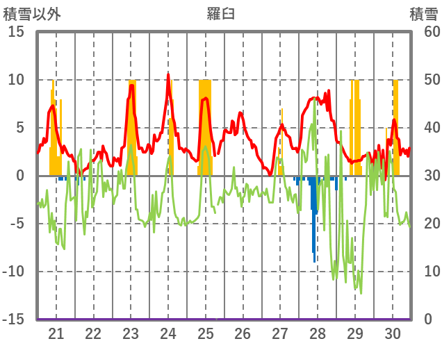 | 日 | 時 | 気温 | 降水 | 風向/風速 | 日照 | 積雪 | 降雪 |